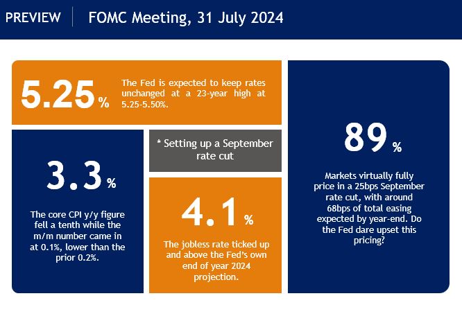 That has meant the Fed is now widely expected to lay the groundwork for a September rate cut at this meeting as policymakers express growing confidence inflation is on the path to 2% and that economic challenges are an increasing focus. The data is also expected to point towards policy easing with employment costs easing, business surveys cooling and the key jobs report indicating growing slack in the labour market.